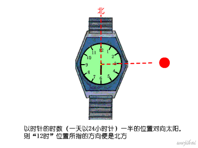 手表水平放置将时针指示的(24小时制)时间数减半后的位置朝向太阳,表盘上12点时刻度所指示的方向就是北方。(举个例子:假如时间是16时,则手表8时的刻度指向太阳,12时刻度所指的就是北方。简单点说:时数折半对太阳,12点所指即北方。)
