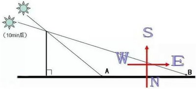 可以用一根标杆(直杆),使其与地面垂直,把一块石子放在标杆影子的顶点A处;约10分钟后,当标杆影子的顶点移动到B处时,再放一块石子。将A、B两点连成一条直线,这条直线的指向就是东西方向。与AB连线垂直的方向则是南北方向,若在北半球,则向太阳的一端是南方,反之则是北方。