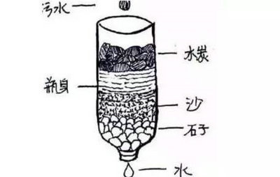 3.简易过滤装置:通过在竹筒或矿泉水瓶按顺序依次填实木炭、土、沙子、小石子来过滤少量的饮用水。